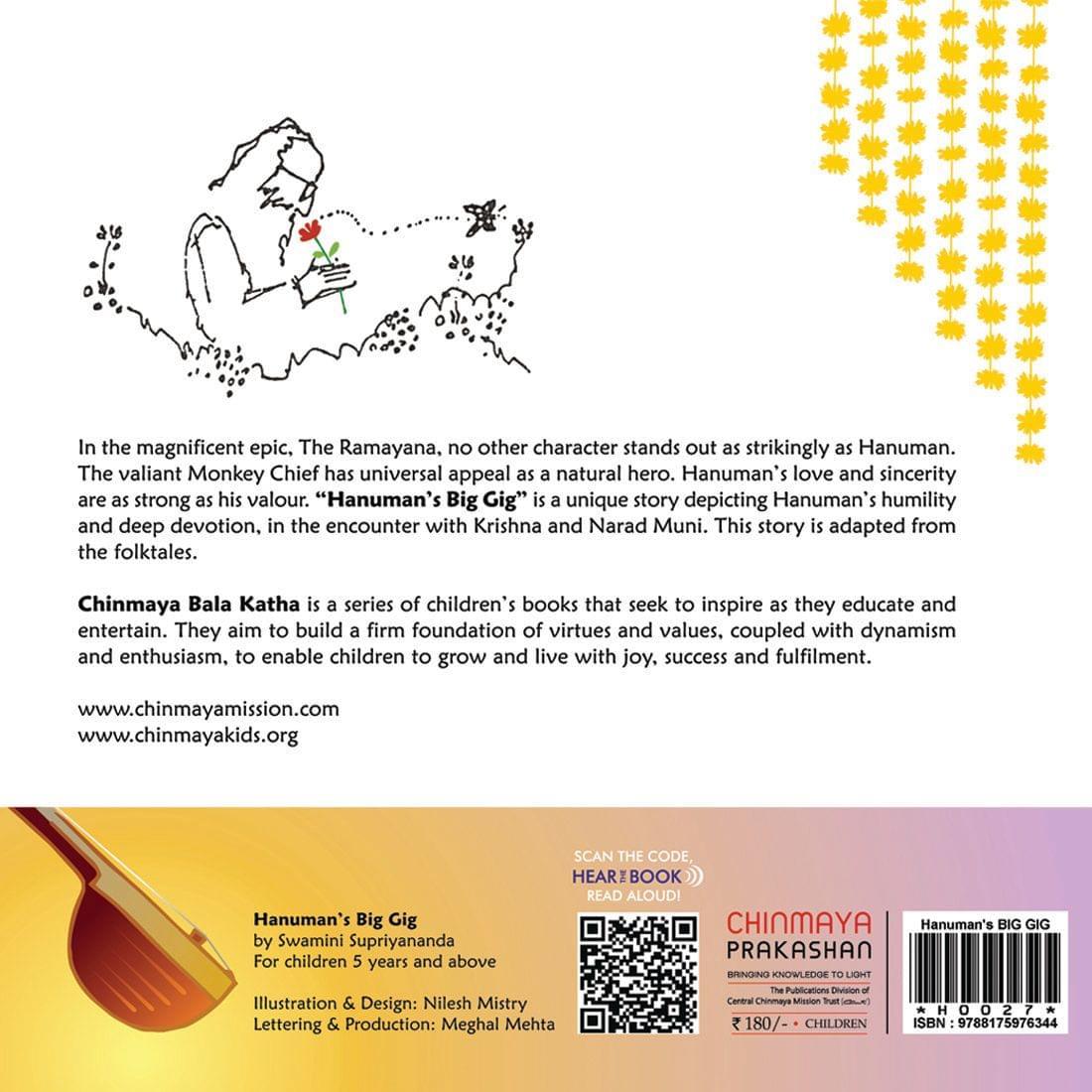 In the magnificent epic, The Ramayana, no other character stands out as strikingly as Hanuman. The valiant Monkey Chief has universal appeal as natural hero. Hanuman's love and sincerity are as strong as his valour. Hanuman's Big Gig is a unique story depicting Hanuman's humility and deep devotion, in the encounter with Krishna and Narad Muni. This story is adapted from the folktales.