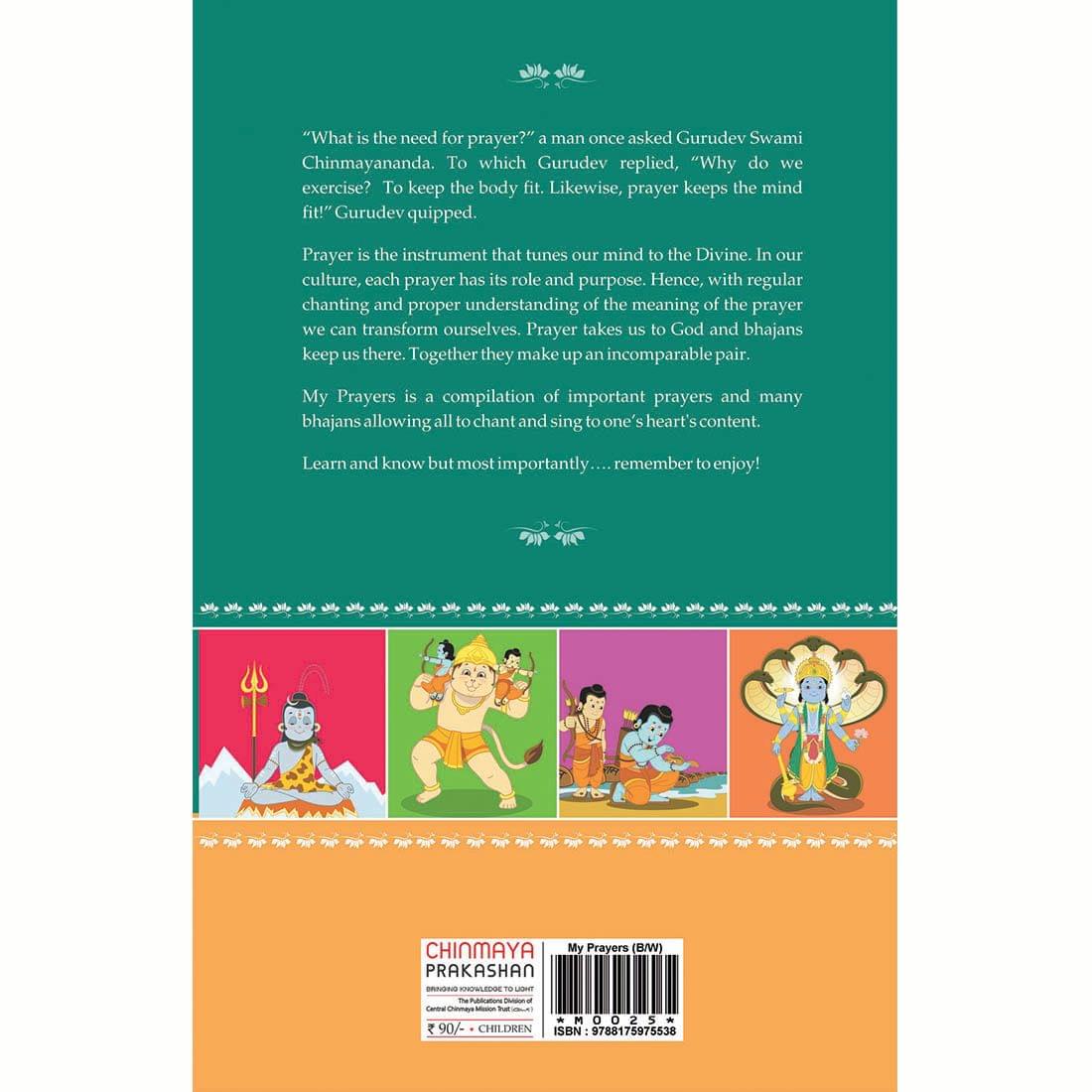 What is the need for Prayers? - A man once asked Gurudev Swami Chinmayananda. To which Gurudev replied, Why do we exercise? To keep the body fit. Likewise, prayer keeps the mind fit, Gurudev quipped. Prayer is the instrument that tunes our mind to the Divine. In our culture, each prayer has its role and purpose. Hence, with regular chanting and a proper understanding of the meaning of the prayer we can transform ourselves. Prayers take us to God and bhajans keep us there. Together they make up an unbeatable pair. My Prayers is a compilation of important prayers, their meaning for most of it and many bhajans allowing us to chant and sing to our heart's content.