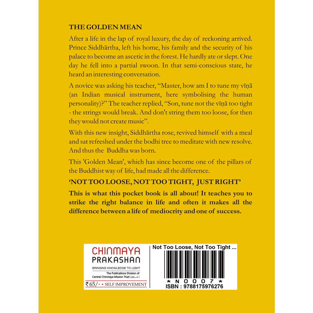 A novice was asking his teacher, "Master, how am I to tune my Veena (an Indian musical instrument, here symbolising the human personality)?" The teacher replied, "Son, tune not the Veena too tight - the strings would break. And don't string them too loose, for then they would not create music".