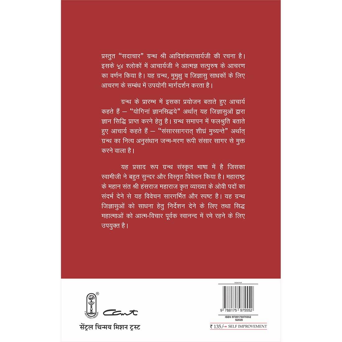 प्रस्तुत ""सदाचार"" ग्रन्थ श्री आदिशंकराचार्यजी की रचना है | इसके ५४ श्लोकों में आचार्यजी ने आत्मज्ञ सत्पुरुष के आचरण का वर्णन किया है | यह ग्रन्थ, मुमुक्ष व् जिज्ञासु साधकों के लिए आचरण के सम्ब्ध में उपयोगी मार्गदर्शन करता है |