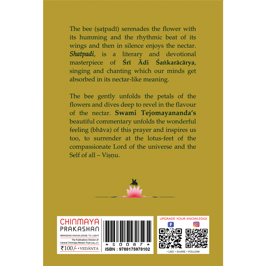 The bee gently unfolds the petals of the flowers and dives deep to revel in the flavour of the nectar. Swami Tejomayananda's beautiful commentary unfolds the wonderful feeling (bhava) of this prayer and inspires us too, to surrender at the lotus-feet of the compassionate Lord of the universe and the self of all - Visnu.